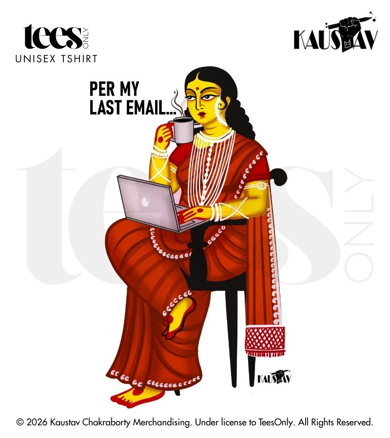 Last Email captures the fatigue, irony, and quiet frustration embedded in modern professional exchanges — where tradition meets deadlines and politeness masks pressure. Rendered through Kalighat patachitra-inspired storytelling, the design transforms a corporate refrain into a layered visual narrative. Crafted with 180 GSM premium cotton, this round neck tee is pre-shrunk and bio-washed to ensure lasting softness, comfort, and durability. Designed for everyday wear, it balances sharp observation with comfort-driven design.