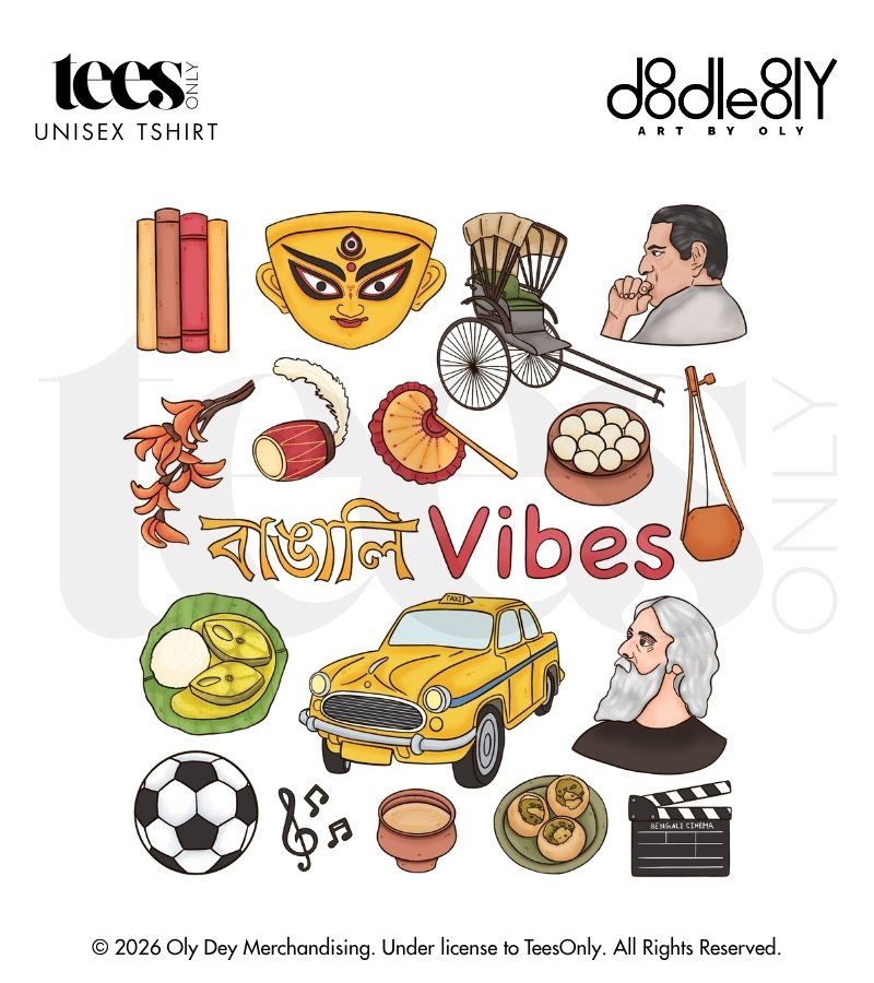 Introducing “Bangali Vibes | Oly Dey” — a lively, character-filled illustration that celebrates the everyday spirit of Bengali life. Rooted in familiarity and warmth, the design brings together playful elements that echo moments we instantly recognize and connect with.