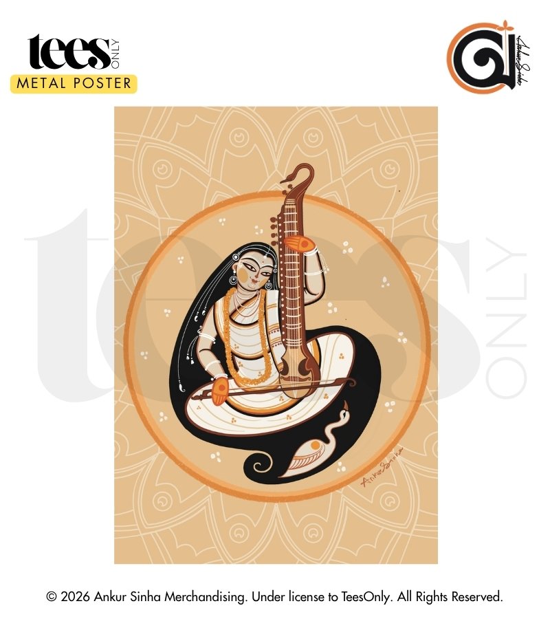 Introducing “Divine Strings | Ankur Sinha” — a metal poster inspired by Maa Saraswati, the embodiment of wisdom, music, and refined expression. Centered around the veena, the artwork reflects a quiet harmony that flows through knowledge, creativity, and inner clarity.