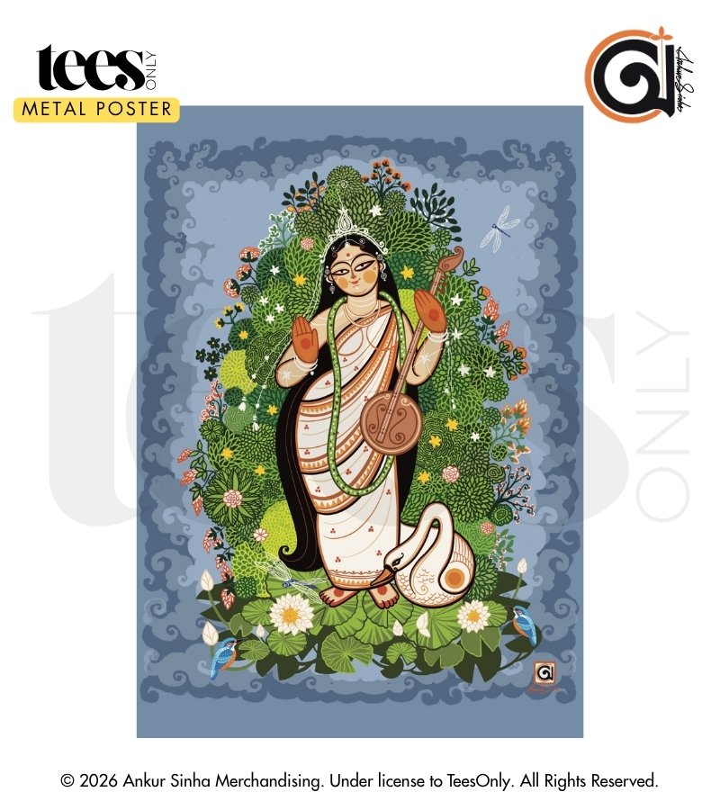 Introducing “Pushpa Veena | Ankur Sinha” — a metal poster inspired by Maa Saraswati, envisioned amidst a blooming garden where knowledge and nature exist in quiet harmony. Surrounded by flowers and gentle abundance, the goddess takes on a softer presence, where wisdom feels organic, flowing as naturally as the world around her.