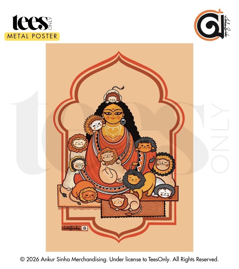 Introducing “Simha Shakti | Ankur Sinha” — a metal poster inspired by Maa Durga, portrayed alongside lion cubs in a moment of quiet strength and familial bond. This interpretation brings forth a softer dimension of Shakti, where power is not only fierce but deeply protective and nurturing.