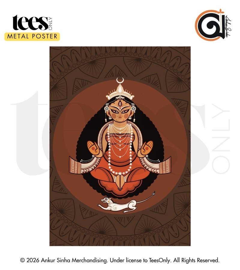 Introducing “Simhasana Durga | Ankur Sinha” — a metal poster inspired by Maa Durga in a composed seated form alongside her vahana, the lion, embodying authority, balance, and unwavering strength. The posture reflects command without aggression — a poised stillness that holds immense power within.