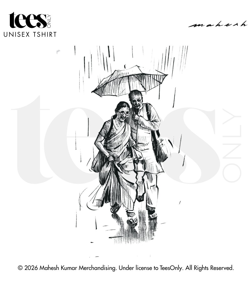 Introducing “The Rains | Mahesh Kumar” — a tender illustration capturing a quiet moment of companionship. An aged married couple walks together through the rain, the husband gently holding an umbrella above them, turning an ordinary walk into a gesture of care and shared life.